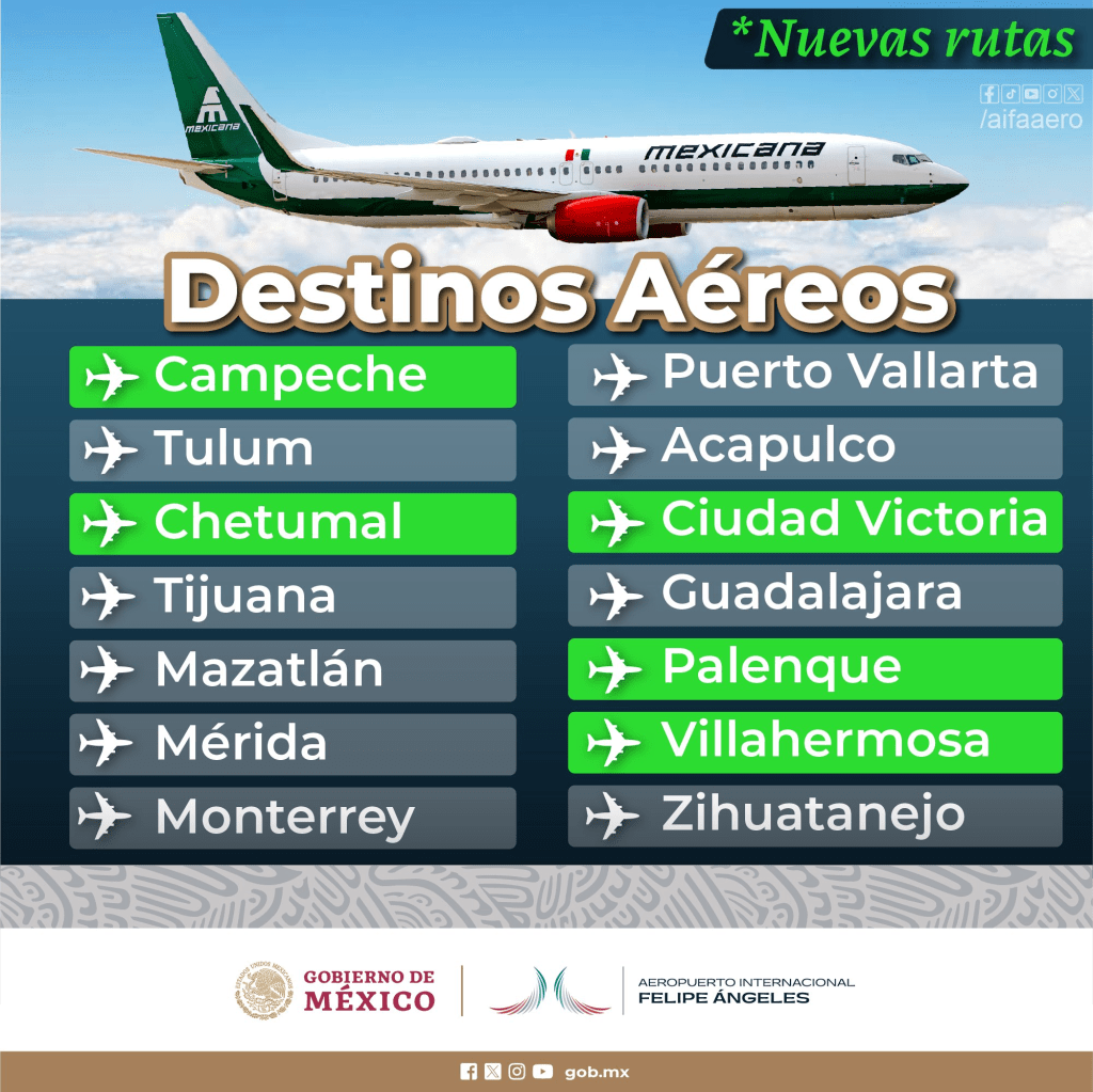 *Aeropuerto Internacional Felipe Ángeles: Para facilitar tu experiencia de viaje, te mostramos los destinos que opera la aerolínea Mexicana en el AIFA. Mira a detalle las rutas y ¿Qué esperas? Elige una y descubre cómo es viajar desde el Aeropuerto Internacional Felipe Ángeles. Destinos Nacionales.-