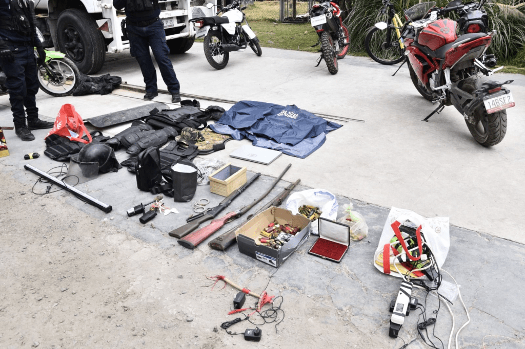 Se decomisaron 91 mil 50 pesos, cinco chequeras, un escudo de plástico color negro, un equipo anti-disturbio, equipo táctico, electrónico y de radiocomunicación; así como dos escopetas, una escopeta hechiza y múltiples cartuchos de diversos calibres.