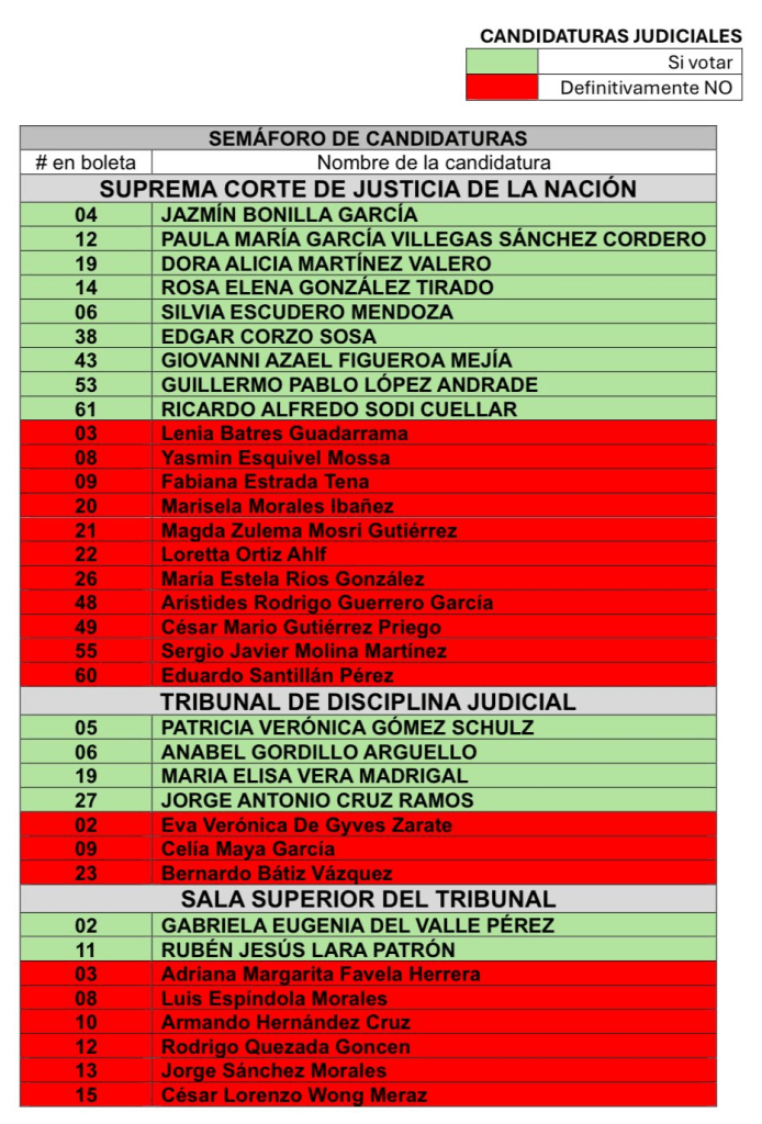 En la impresión se aprecia que los nombres en color beige son por quienes deben votar y los que aparecen en rojo ni un voto.