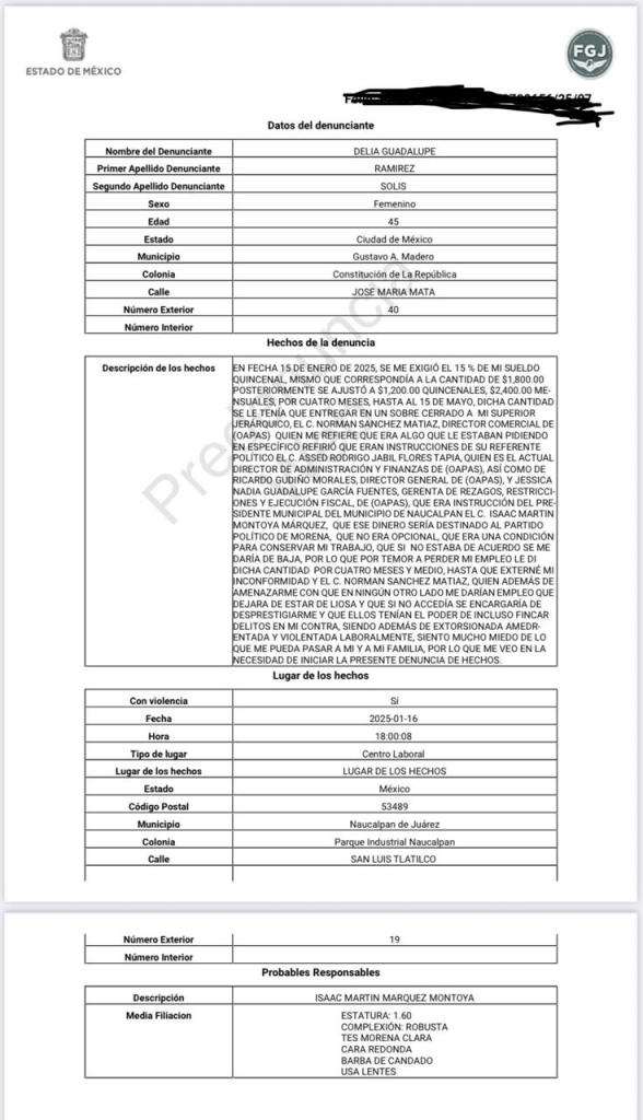 Los tres empleados que se negaron seguir, pagando un diezmo quincenal de su bajo salario fueron dados de baja del Organismo de Agua de Naucalpan.