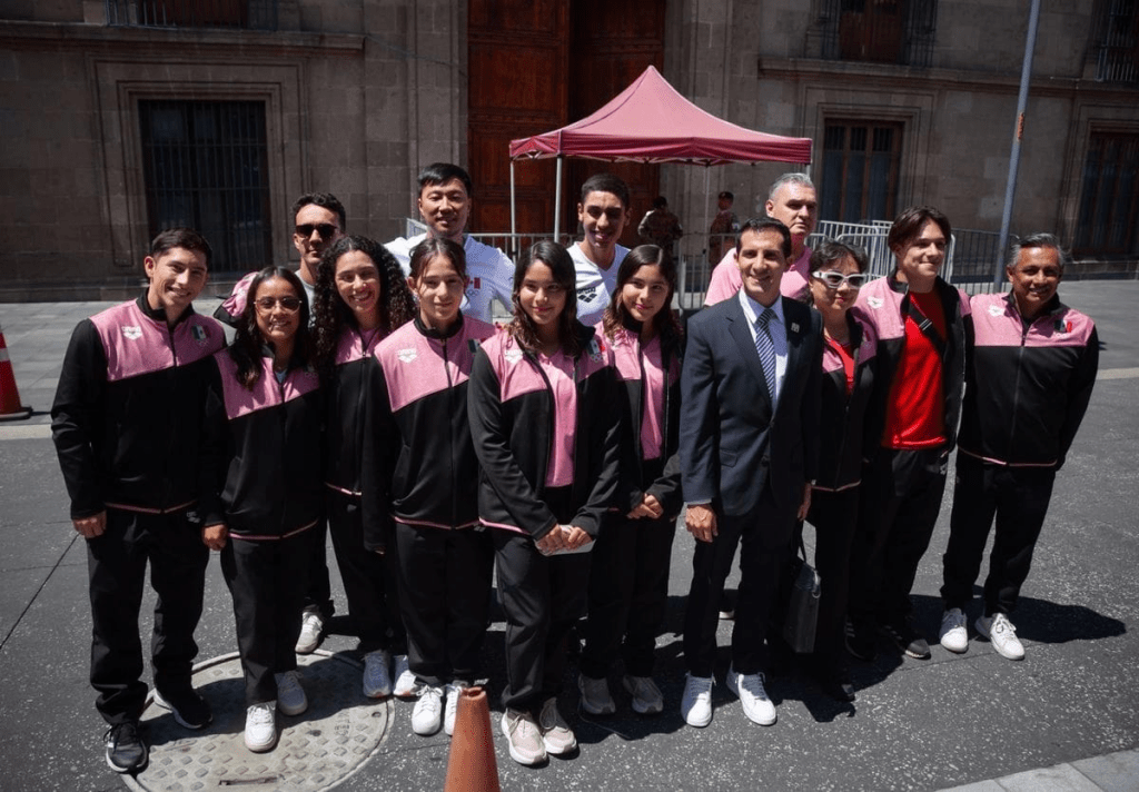 La presidenta, Claudia Sheinbaum Pardo, recibió este martes en Palacio Nacional a la delegación mexicana de clavadistas que participó en el Campeonato Mundial de Deportes Acuáticos celebrado en Singapur. Entre los deportistas estaba Osmar Olvera, quien logró la medalla de oro en la prueba individual de trampolín de 3 metros.