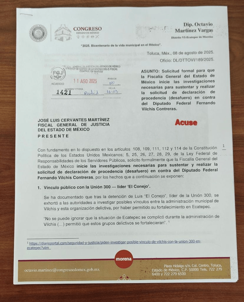 Por presuntos vínculos con el crimen organizado, espionaje y daño patrimonial, el diputado Octavio Martínez Vargas presentó una solicitud formal ante la Fiscalía General de Justicia del Estado de México (FGJEM) para que se investigue al ex alcalde de Ecatepec y actual diputado federal por el Partido del Trabajo (PT) Fernando Vilchis Contreras.