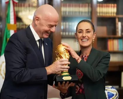SHEINBAUM SE REUNIÓ CON INFANTINO EN PALACIO NACIONAL ⚽La presidenta Claudia Sheinbaum recibió en un Palacio Nacional a Gianni Infantino, presidente de la FIFA, y cargó el trofeo de la Copa del Mundo, tal como lo hizo Donald Trump en días pasados.