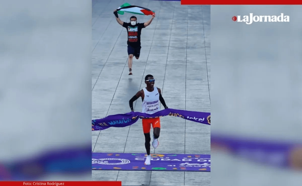 A la meta también llegaron un par de corredores ondeando la bandera de Palestina, uno de ellos sin número detrás del ganador etíope.