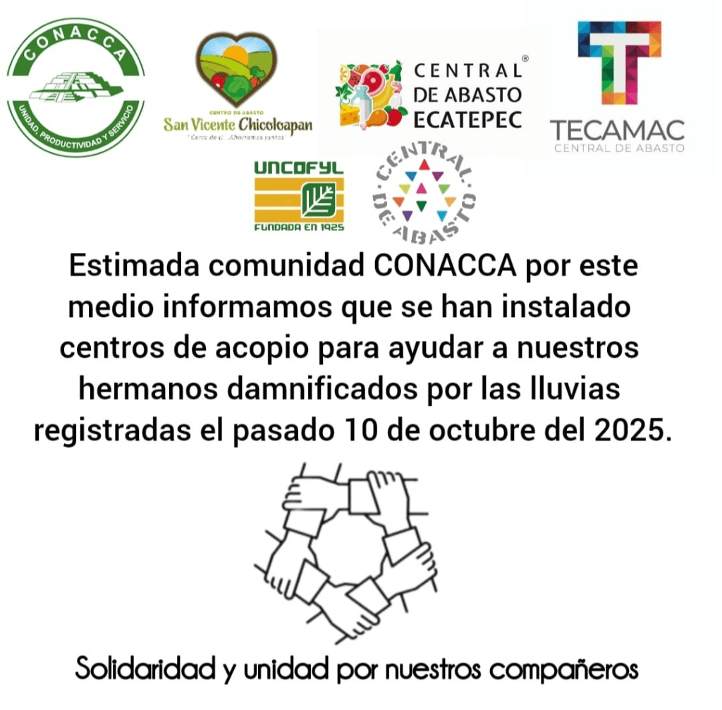 Las Centrales de Abasto de México, CONACCA daremos prioridad para garantizar el suministro de alimentos a las familias de los estados afectados. Nuestro Presidente Miguel Farias nos ha convocado a instalar centros de acopio de alimentos en todo el país. Manos a la obra. Nuestros Hermanas y Hermanos nos necesitan.