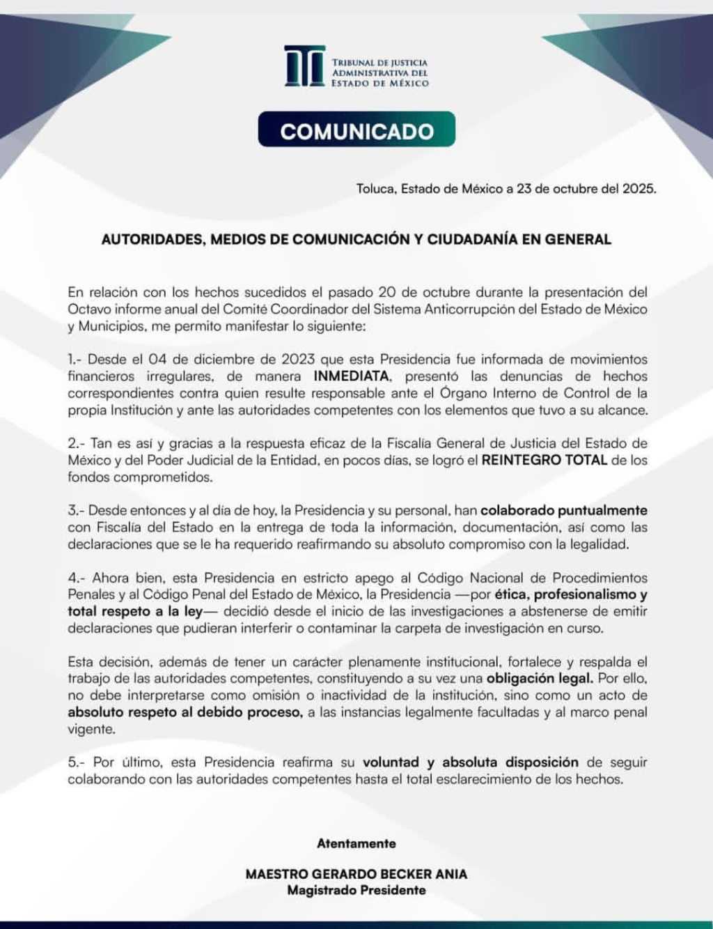 Pero para que no quepa duda, haré pública la información bancaria que acredita a qué cuentas fueron depositados los 32.4 millones de pesos y quién los deposito, donde quedara evidenciado la complicidad de servidores públicos de la Fiscalía General de Justicia del Estado de México y del Tribunal de Justicia Administrativa del Estado de México, que por cierto, sigue sin sancionarse a los delincuentes de cuello blanco.