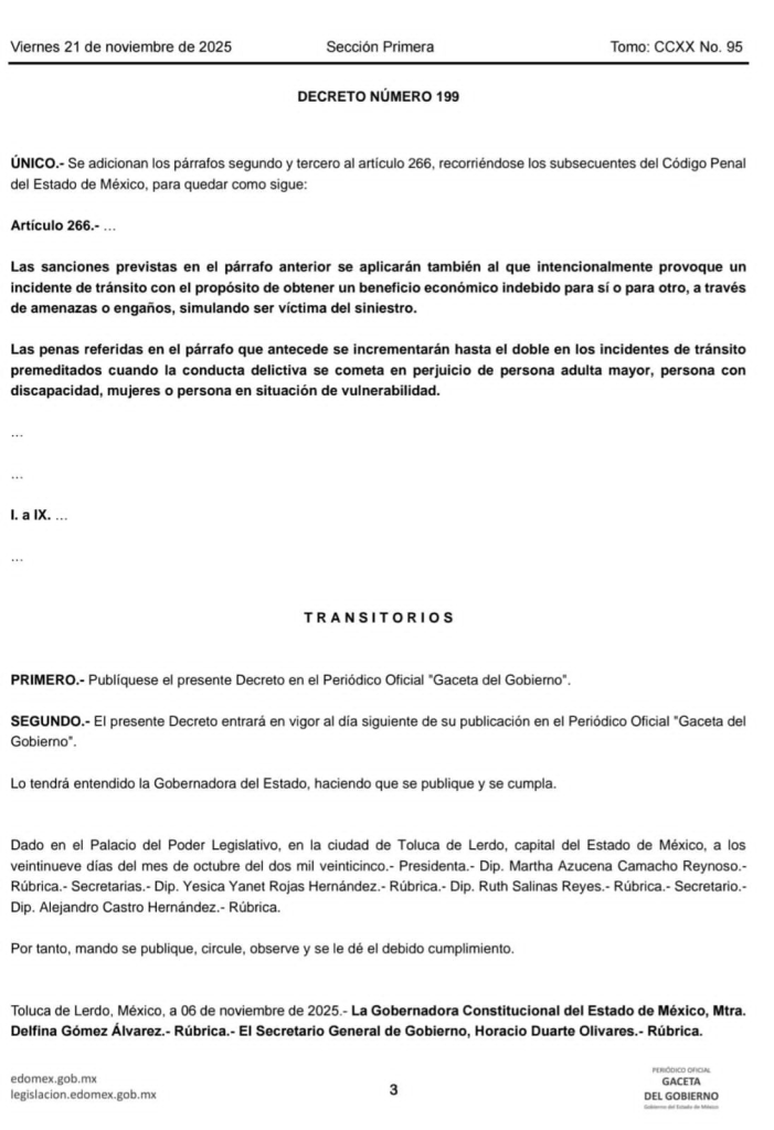 Hoy se publica en Gaceta de Gobierno el decreto que reforma el Código Penal del Edomex para sancionar a «los montachoques», es decir, a quienes intencionalmente provoquen un incidente de tránsito para obtener un beneficio económico indebido.