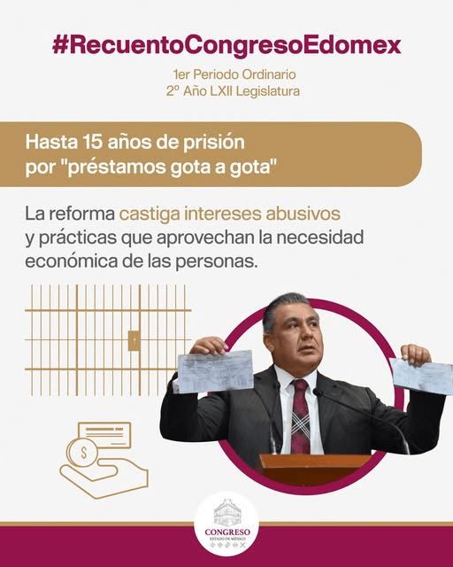 El Congreso del Estado de México aprobó sanciones de hasta 15 años de prisión contra quienes realicen “préstamos gota a gota” o cualquier forma de usura.