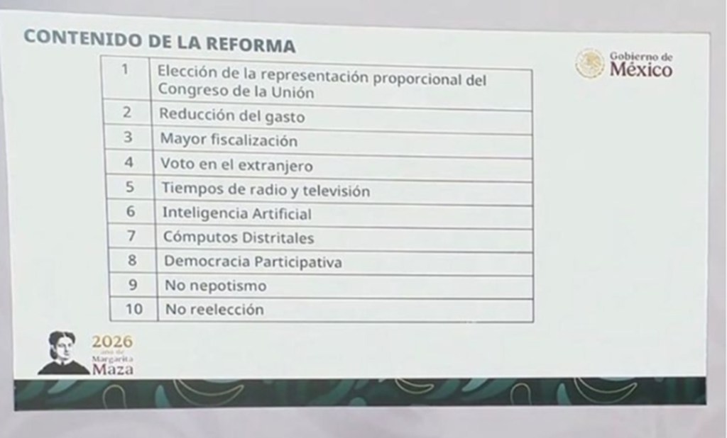 Ayer, en presentación Power Point, Claudia Sheinbaum dio más señales de lo estará incluido en la reforma electoral, algo que la sociedad civil no ha pedido, pero el gobierno se ha encargo de esparcir a través de su narrativa de la necesidad de ella.