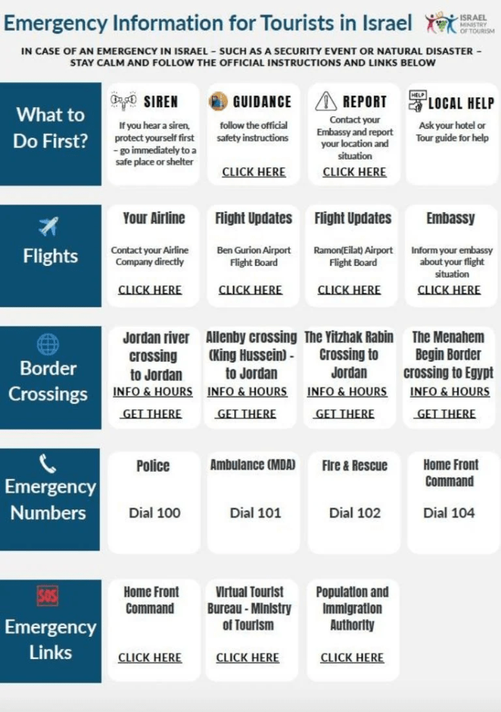 El Ministerio de Turismo de Israel ha puesto a disposición de los turistas que actualmente se encuentran en el país un sistema de registro para apoyar su salida del país, incluyendo posible transporte hacia el cruce fronterizo de Taba (Egipto) a partir del 4 de marzo.