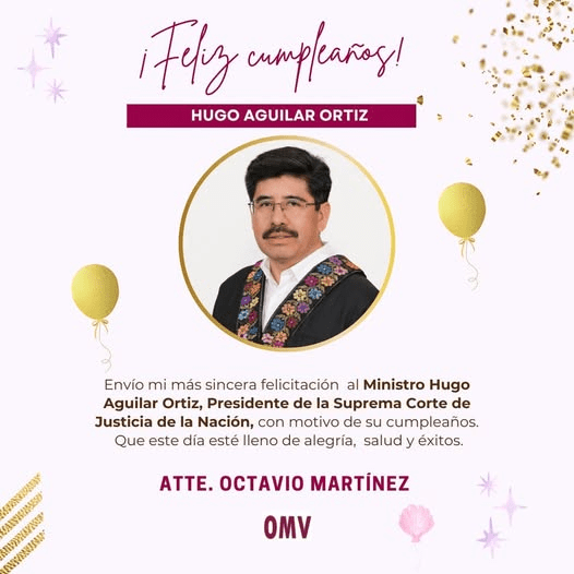 El diputado local mexiquense, Octavio Martínez Vargas, envió un mensaje de felicitación al Ministro Hugo Aguilar Ortiz, Presidente de la Suprema Corte de Justicia de la Nación, con motivo de su cumpleaños.
