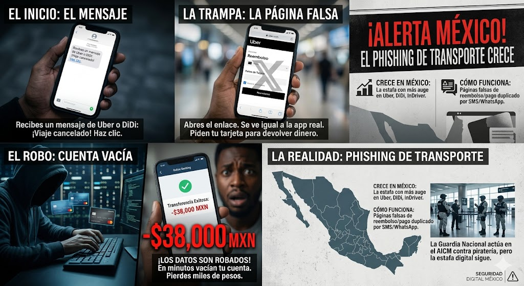 Los delincuentes crean páginas falsas idénticas a las de Uber, DiDi e InDriver. Las envían por SMS o WhatsApp con el pretexto de un viaje cancelado, un cobro duplicado o un reembolso pendiente.