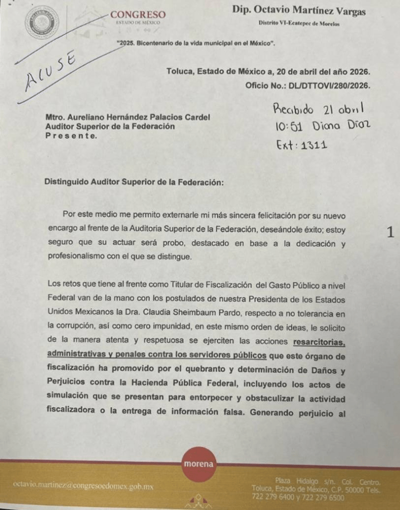El diputado local mexiquense Octavio Martínez Vargas presentó de manera formal ante el nuevo titular de la Auditoría Superior de la Federación (ASF) la solicitud de iniciar acciones administrativas y judiciales contra el diputado Fernando Vilchis Contreras, señalado como líder del crimen en Ecatepec.